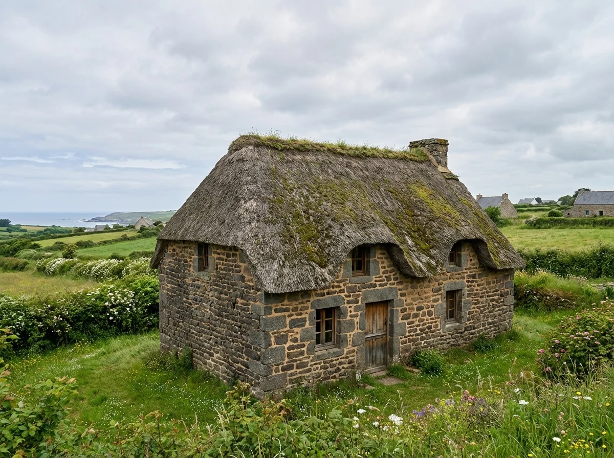 La Bretagne est renommée pour ses chaumières faites de chaume. Ce matériau naturel offre non seulement une excellente isolation thermique mais aussi une intégration harmonieuse dans les paysages verdoyants bretons. La structure de base peut inclure des murs en terre battue ou en pierres locales comme le granit, solidifiant ainsi l’édifice face aux conditions météo parfois rudes du littoral atlantique.